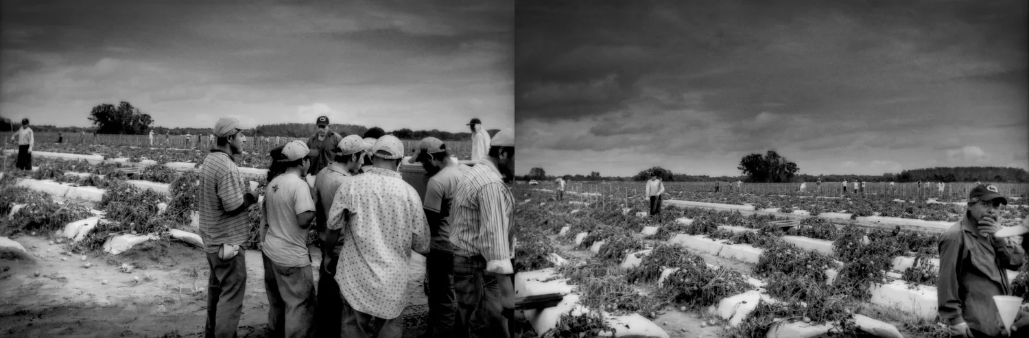 (L) 30 second encounter with workers in field: Tomato pickers, mostly Mexican and Central American migrant workers, wait to get drinking water from the back of a truck moments before the crew boss (facing camera in rear with mustache and wearing a d